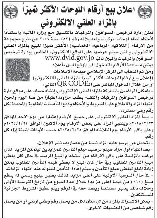أعلنت إدارة الترخيص ، عن طرح مجموعة من الارقام المميزة (ثلاثية، رباعية،خماسية) في المزاد العلني الالكتروني، وذلك اعتبارا من يوم الأحد القادم 23/2/2025.