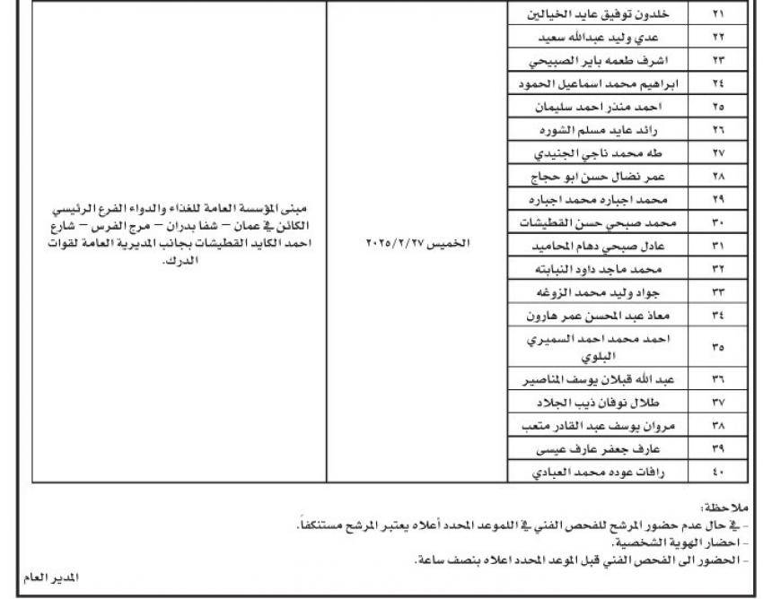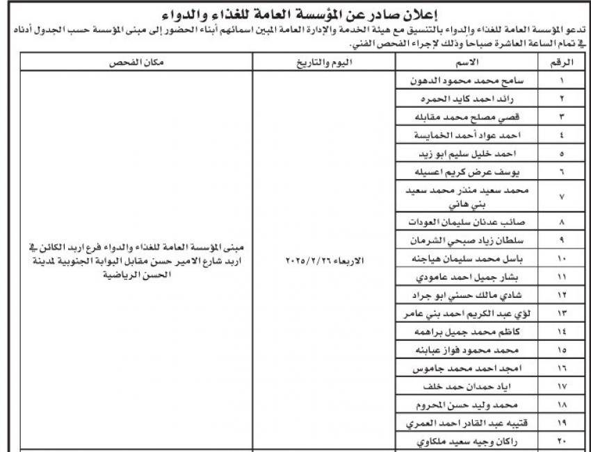 دعت المؤسسة العامة للغذاء والدواء وسلطة منطقة العقبة الاقتصادية الخاصة، بالتنسيق مع إدارة تقييم الكفايات الوظيفية/ هيئة الخدمة والادارة العامة ، المرشحين التالية اسماؤهم لغايات اجراء المقابلة الشخصية والامتحان التنافسي الالكتروني .