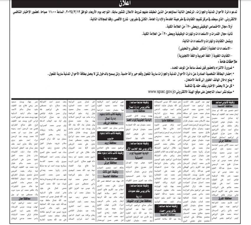 دعت دائرة الاحوال المدنية والجوازات المرشحين المرفقة اسماءهم أدناه، الى الحضور لاجراء الامتحان التنافسي الالكتروني الذي سيعقد في مركز تقييم الكفايات في مقر هيئة الخدمة والادارة العامة . وتاليا الاسماء والتفاصيل: