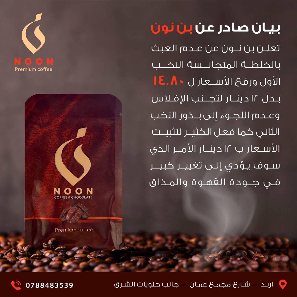 أصدرت شركة بن نون بياناً رسمياً أعلنت فيه رفع أسعار القهوة المتجانسة النخب الأول لتصبح ١٤.٨٠ ديناراً بدلاً من ١٢ ديناراً.