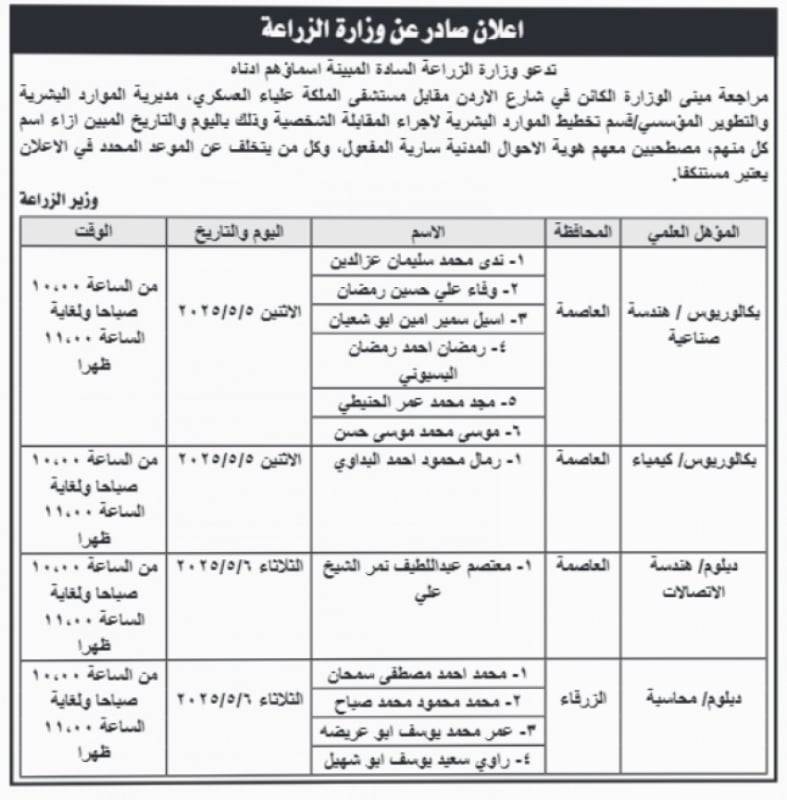 أعلنت عدد من المؤسسات الرسمية، اليوم الأحد، عن حاجتها لتعبئة وظائف شاغرة، فيما دعت مؤسسات أخرى عددًا من المرشحين لإجراء المقابلات الشخصية.