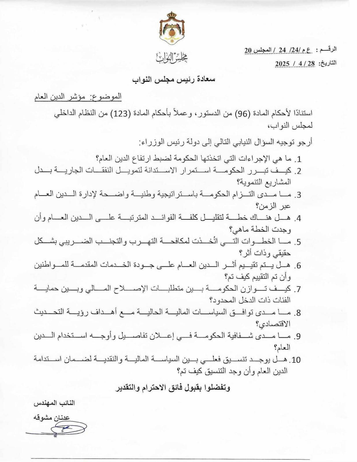 وجه النائب عدنان مشوقة سؤالا نيابيا للحكومة حول الإجراءات التي اتخذتها الحكومة لضبط ارتفاع الدين العام.
