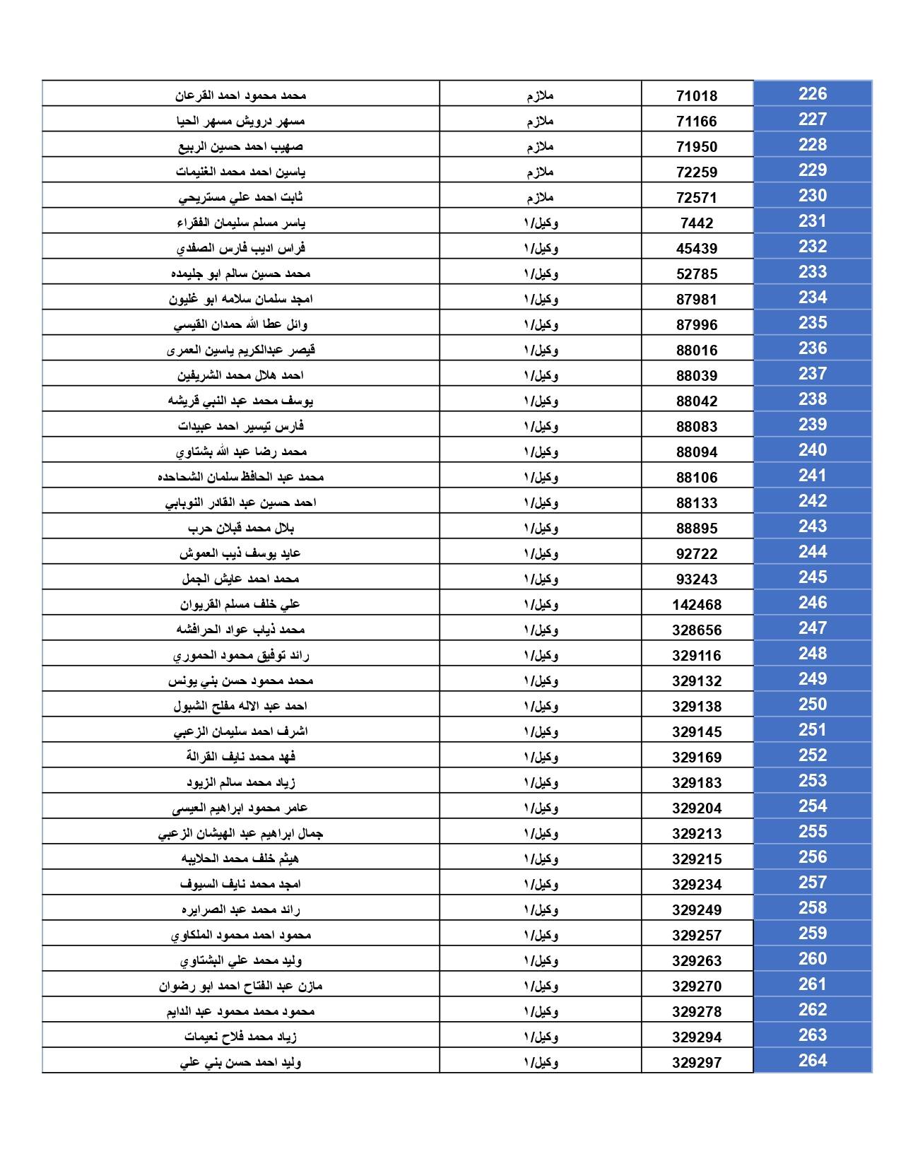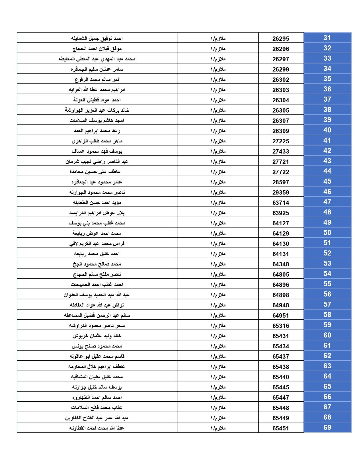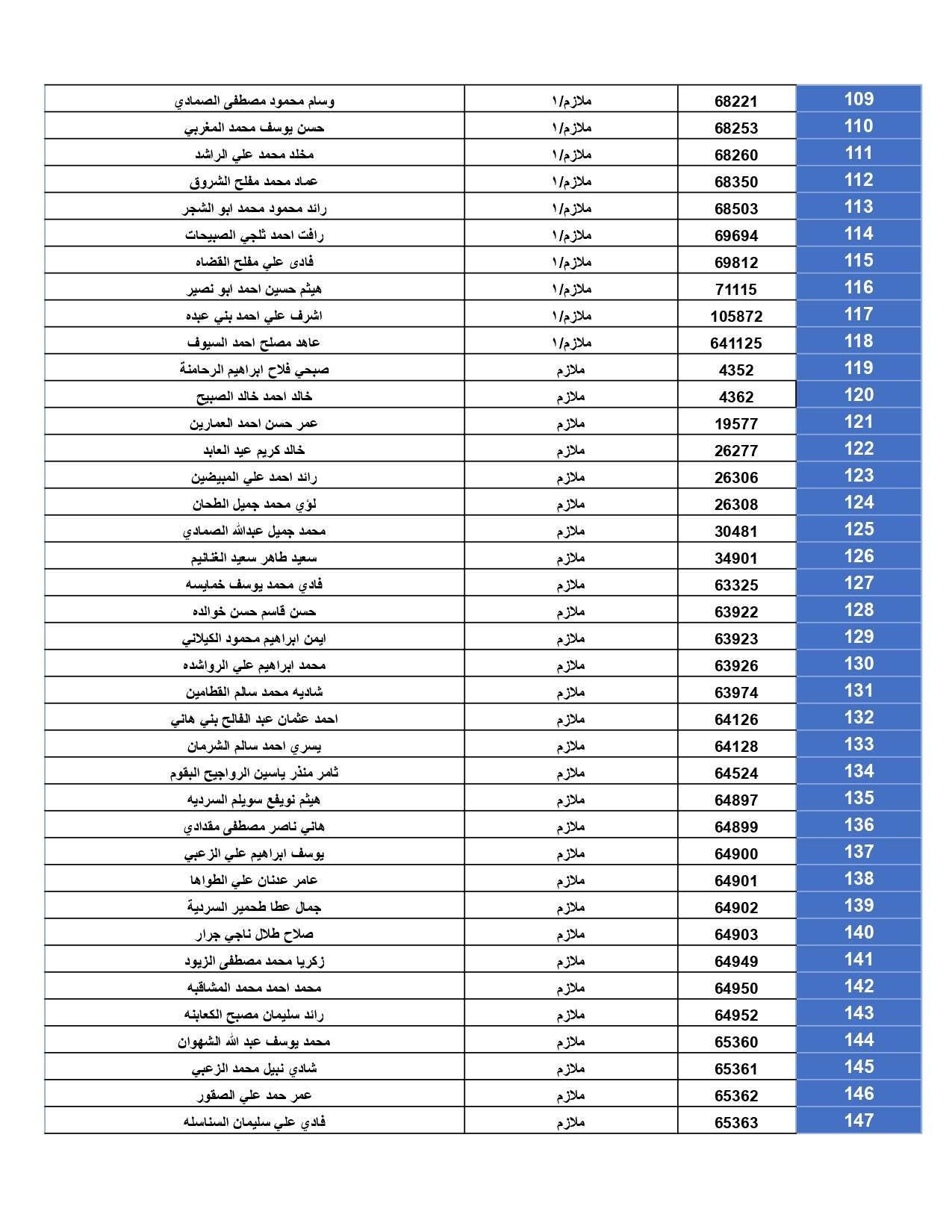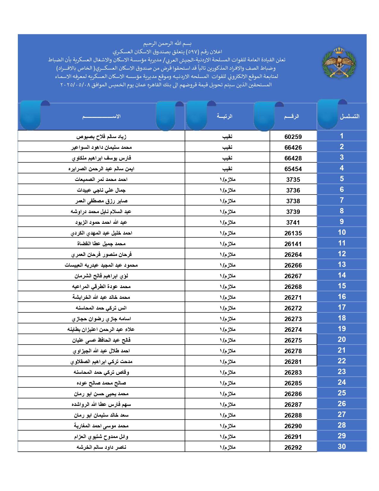 أعلنت القيادة العامة للقوات المسلحة الأردنية – الجيش العربي/ مديرية مؤسسة الإسكان والأشغال العسكرية، أن الضباط وضباط الصف والأفراد المبينة أسماءهم أدناه قد استحقوا قرض الإسكان العسكري (الخاص بالافراد)، وعلى الضباط المستفيدين من صندوق إسكان الضباط مراجعة بنك القاهرة عمان بكافة فروعه خلال ساعات الدوام الرسمي اعتباراً من يوم الخميس الموافق 8/05/2025 للحصول على القرض.