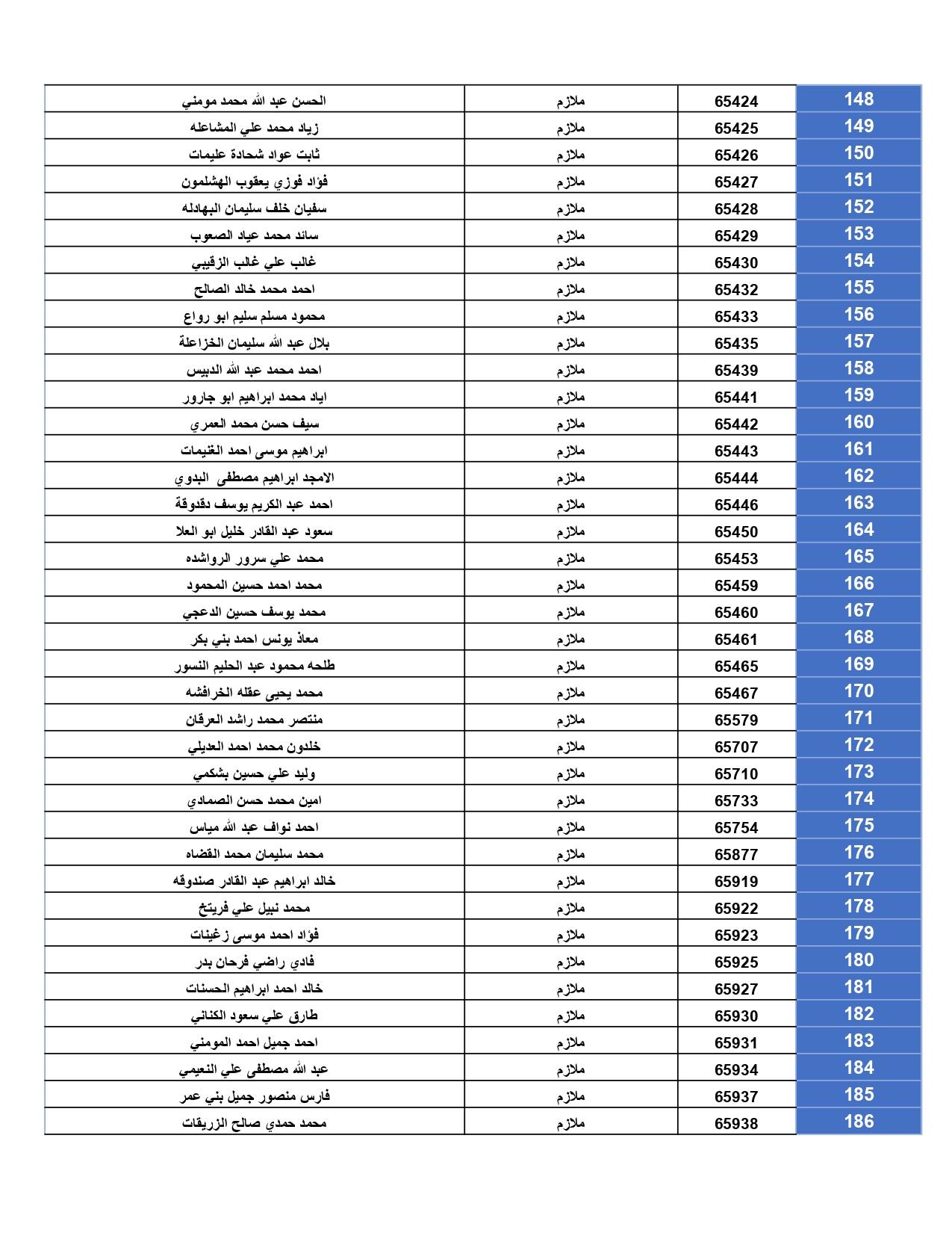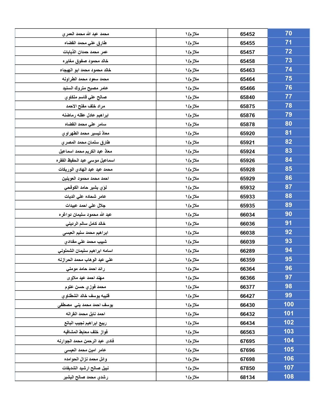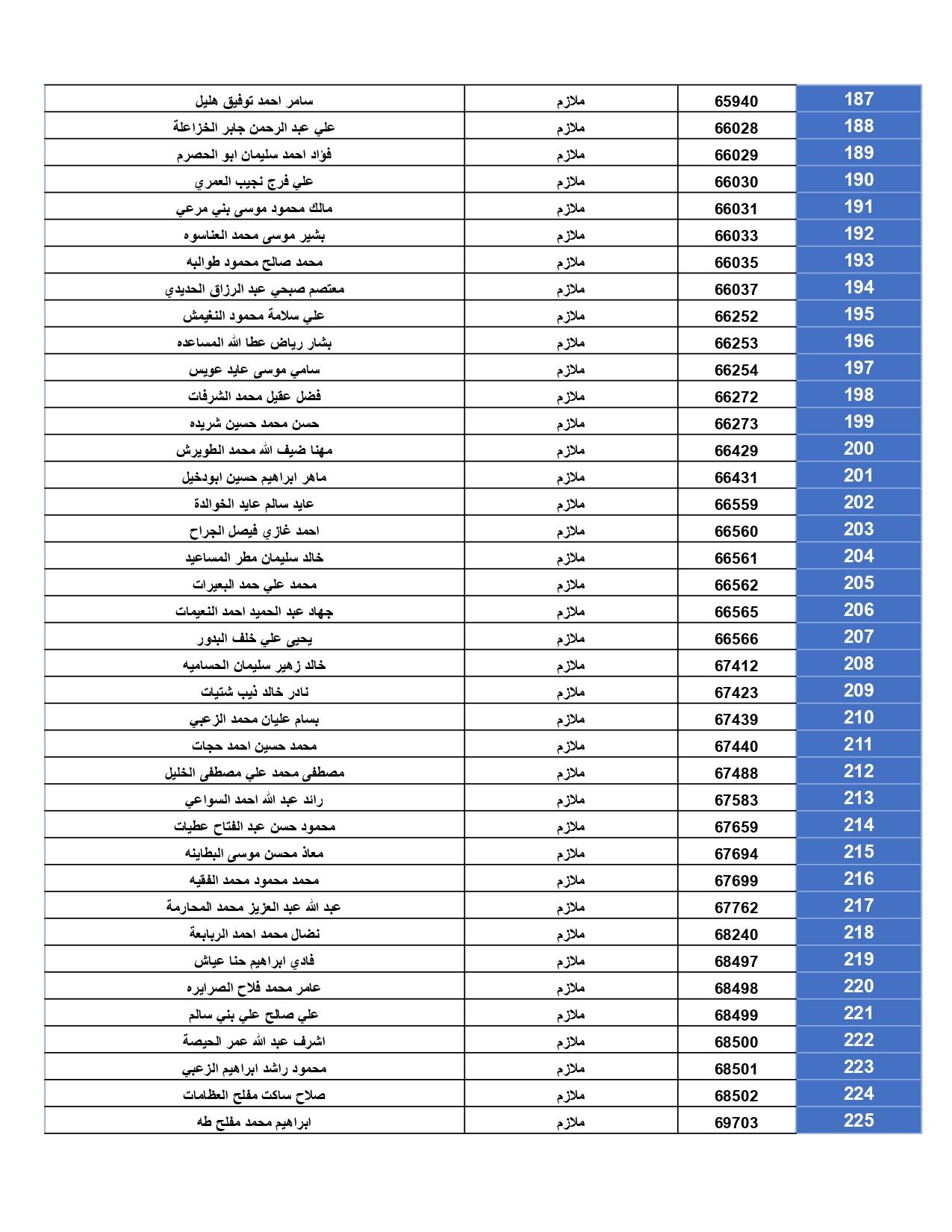أعلنت القيادة العامة للقوات المسلحة الأردنية – الجيش العربي/ مديرية مؤسسة الإسكان والأشغال العسكرية، أن الضباط وضباط الصف والأفراد المبينة أسماءهم أدناه قد استحقوا قرض الإسكان العسكري (الخاص بالافراد)، وعلى الضباط المستفيدين من صندوق إسكان الضباط مراجعة بنك القاهرة عمان بكافة فروعه خلال ساعات الدوام الرسمي اعتباراً من يوم الخميس الموافق 8/05/2025 للحصول على القرض.