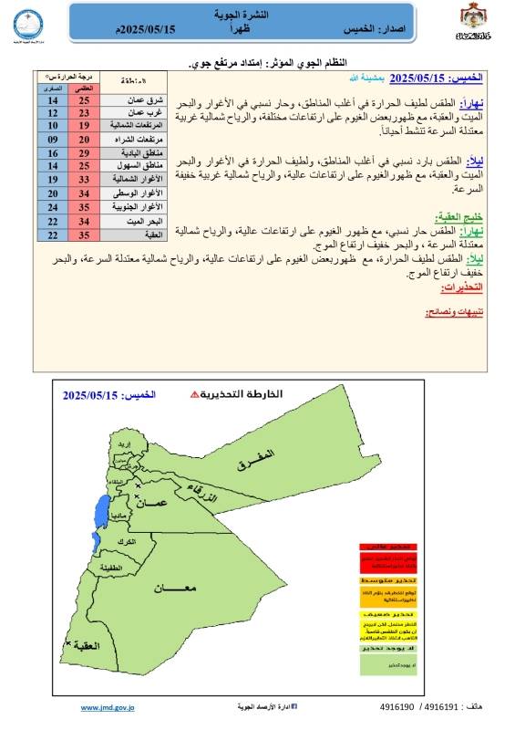 ويكون الطقس جافا ومغبرا وحارا في أغلب المناطق، وحارا جدافي البادية والأغوار والبحر الميت والعقبة، مع ظهور الغيوم على ارتفاعات عالية، والرياح جنوبية شرقية معتدلة السرعة تنشط أحياناً.