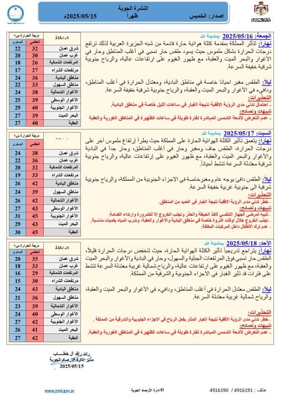 وقالت دائرة الأرصاد الجوية في نشرتها التفصيلية الصادرة ظهر الخميس إنه سيتعمق نهار السبت تأثير الكتلة الهوائية الحارة على المملكة، حيث يطرأ ارتفاع ملموس آخر على درجات الحرارة.