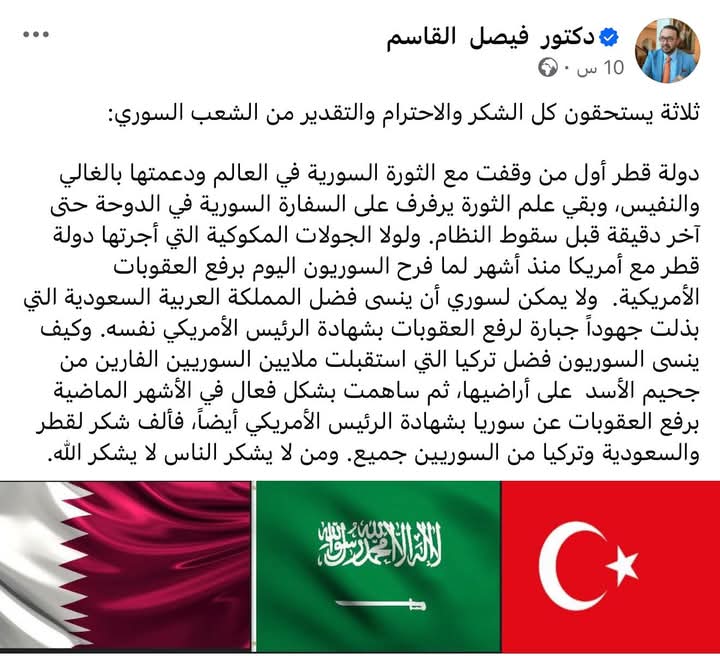 الاعلامي في قناة الجزيرة فيصل القاسم كتب تغريدة يقول فيها "ثلاث دول تستحق الشكر على وقوفها مع سوريا خلال محنتها وذكر المملكة العربية السعودية وقطر وتركيا"