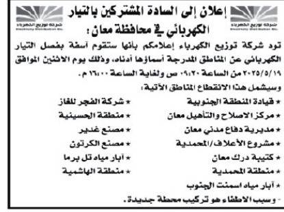 وستتم عملية فصل التيار الكهربائي يوم الاثنين 19/5/2025 من الساعة 9:30 صباحًا حتى الساعة 4:00 مساءً في محافظة معان، حيث سيشمل الفصل المناطق التالية: