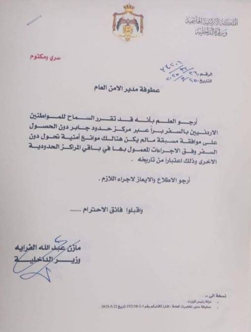 قرر وزير الداخلية مازن الفراية السماح للمواطنين الأردنيين بالسفر برا عبر مركز حدود جابر دون الحصول على موافقة مسبقة .