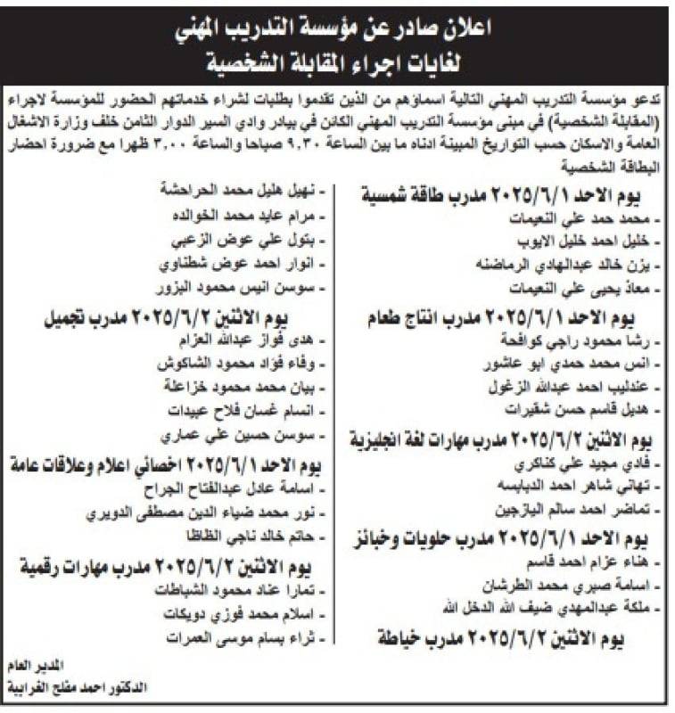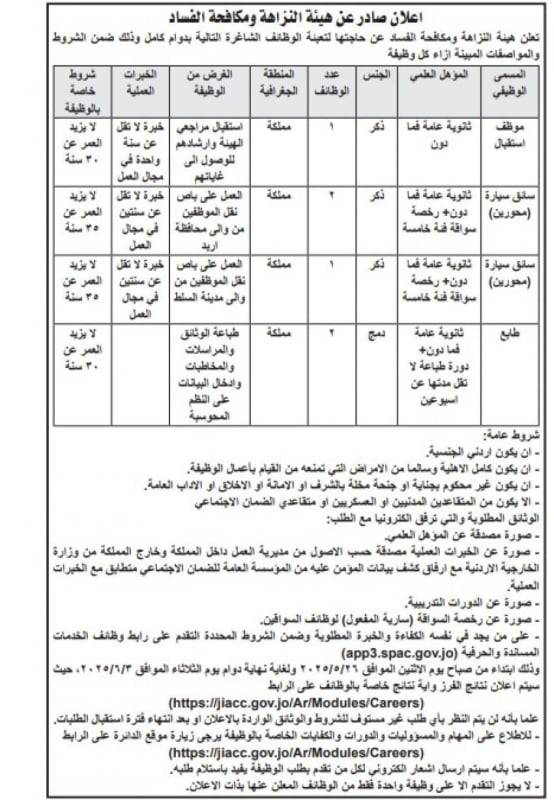 علنت عدد من المؤسسات الرسمية،الثلاثاء، عن حاجتها لتعبئة وظائف شاغرة لديها، فيما دعت أخرى عددًا من المرشحين لإجراء المقابلات الشخصية لغايات استكمال اجراءات التعيين.