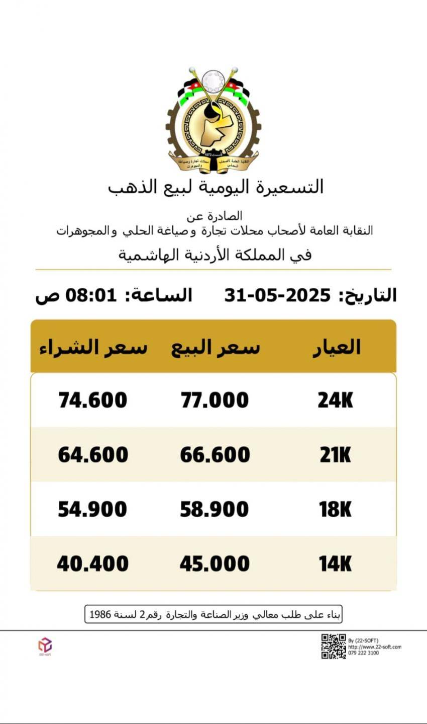كما بلغ سعر بيع الغرام الواحد من الذهب عيارات 24 و18 و14 لغايات البيع من محالّ الصاغة، 77.0، 58.90، 45.00 دينارا على التوالي.