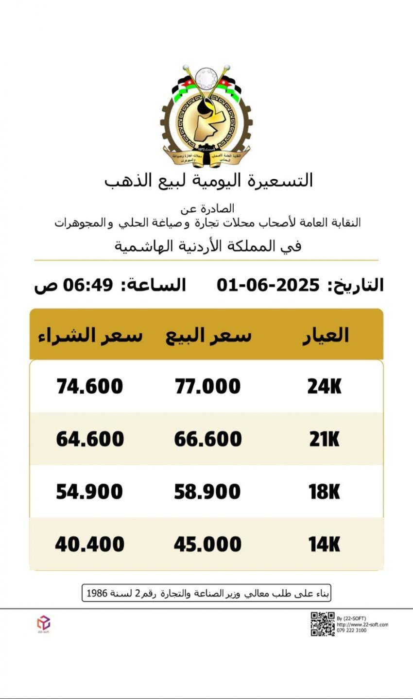 كما بلغ سعر بيع الغرام الواحد من الذهب عيارات 24 و18 و14 لغايات البيع من محالّ الصاغة، 77، 58.9، 45 دينارا على التوالي.