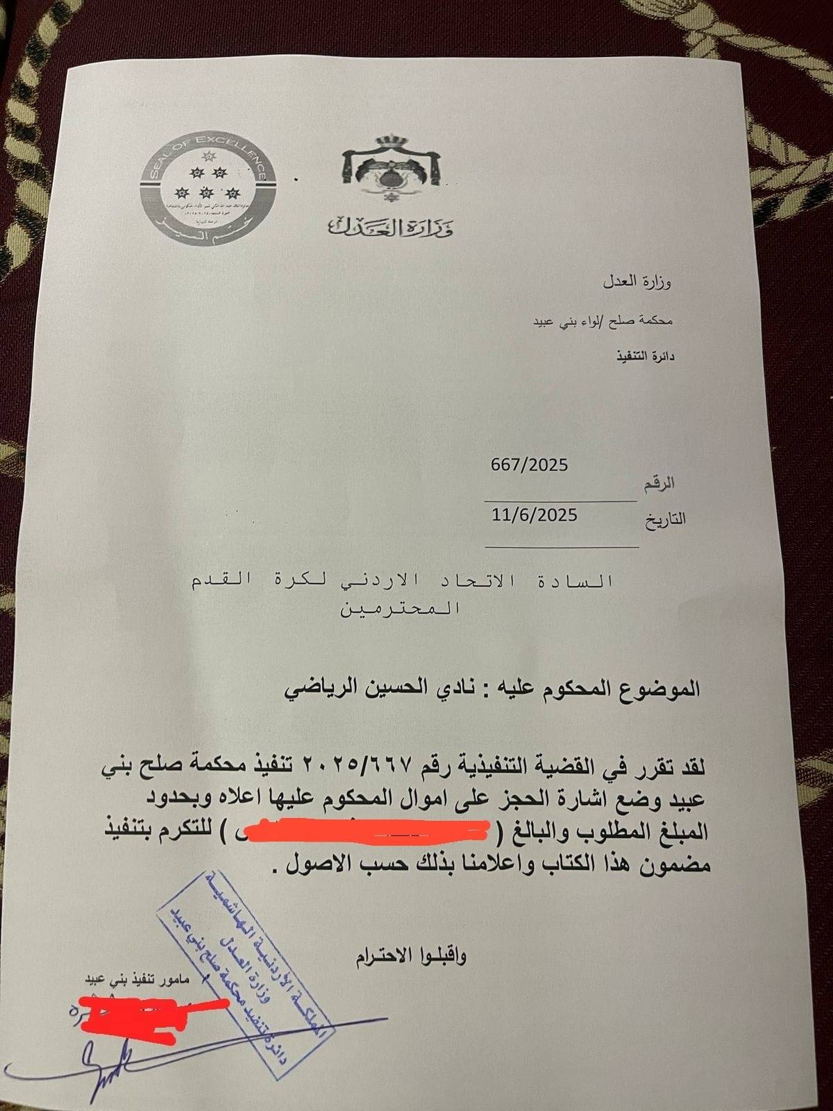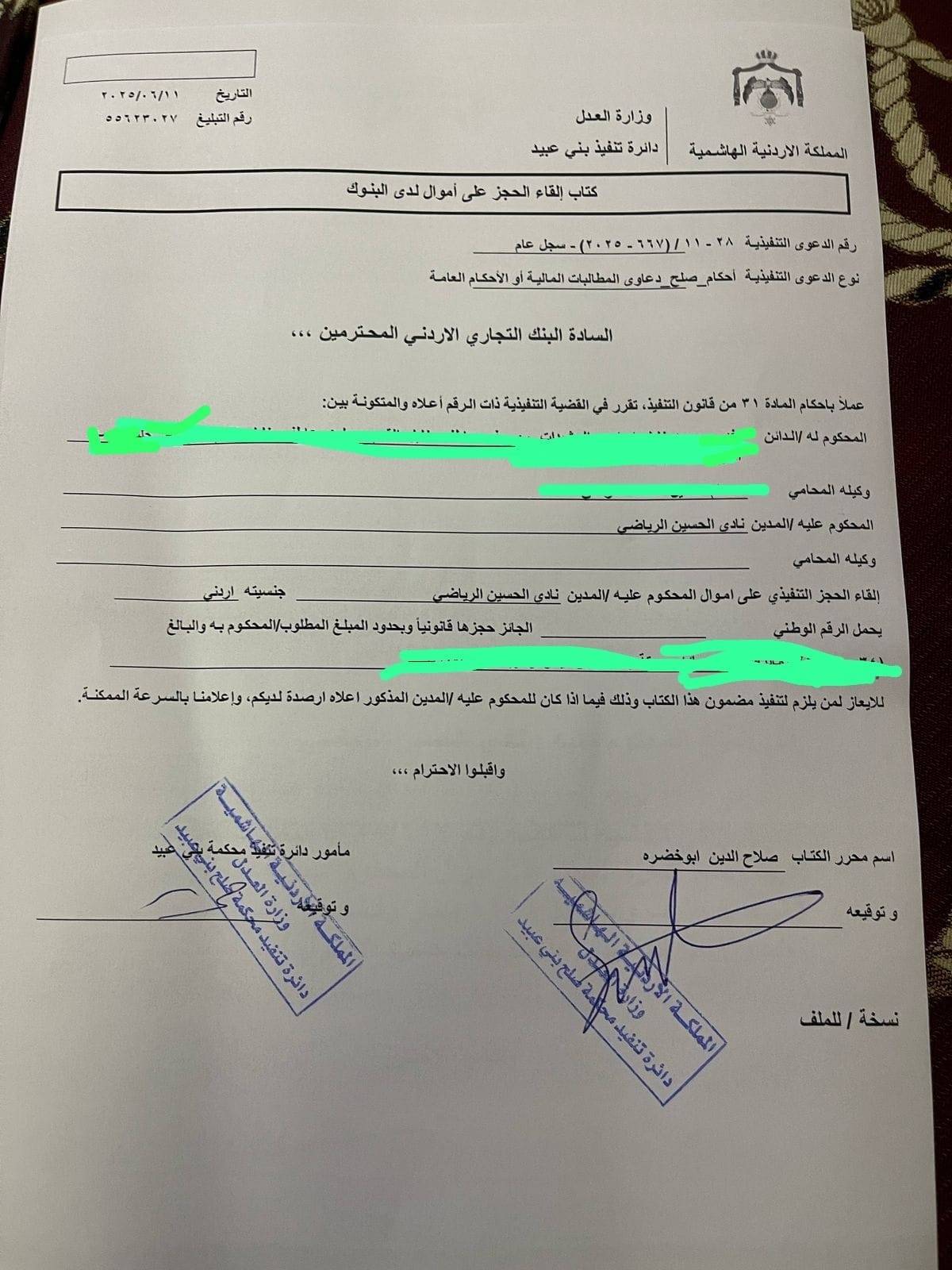 قرارا من دائرة التنفيذ لمحكمة صلح لواء بني عبيد التابعة لوزارة العدل، بالحجز على أموال النادي لدى البنوك
