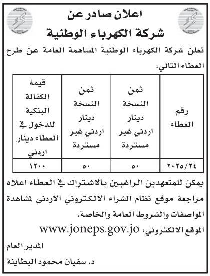 أعلنت شركة الكهرباء الوطنية المساهمة العامة عن طرح العطاء رقم (2025/24)، ودعت المتعهدين الراغبين إلى التقدم للمشاركة فيه عبر نظام الشراء الإلكتروني الأردني.
