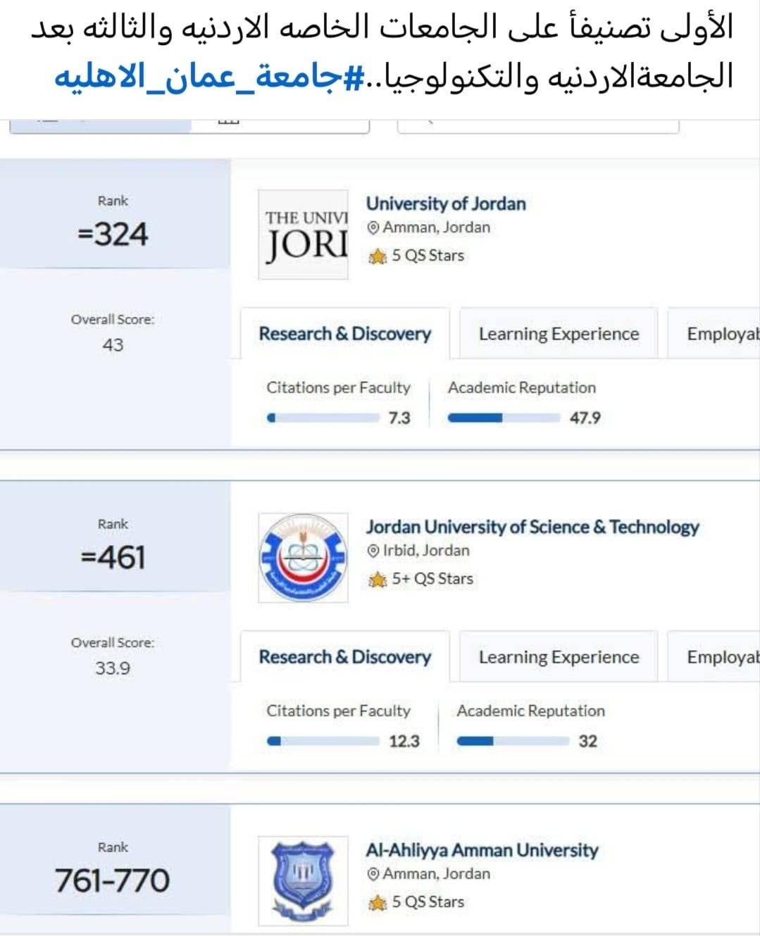 حققت جامعة عمان الأهلية تقدماً لافتاً عن السنوات السابقة في موقعها بين أفضل جامعات العالم ، حيث صُنّفت ضمن أفضل 761 جامعة على مستوى العالم حسب تصنيف كيو أس العالمي 2026 وجاءت بالمرتبة الأولى على الجامعات الأردنية الخاصة وبالمرتبة الثالثة على الجامعات الأردنية الحكومية والخاصة بعد الجامعة الأردنية وجامعة العلوم والتكنولوجيا الأردنية.