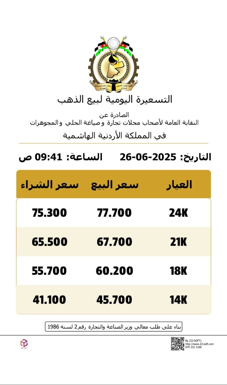 استقرت أسعار بيع غرام الذهب عيار 21 الأكثر رغبة من المواطنين في السوق المحلية، الخميس، عند 67.70 دينارا لغايات البيع من محلات الصاغة، مقابل 65.50 دينارا لجهة الشراء.