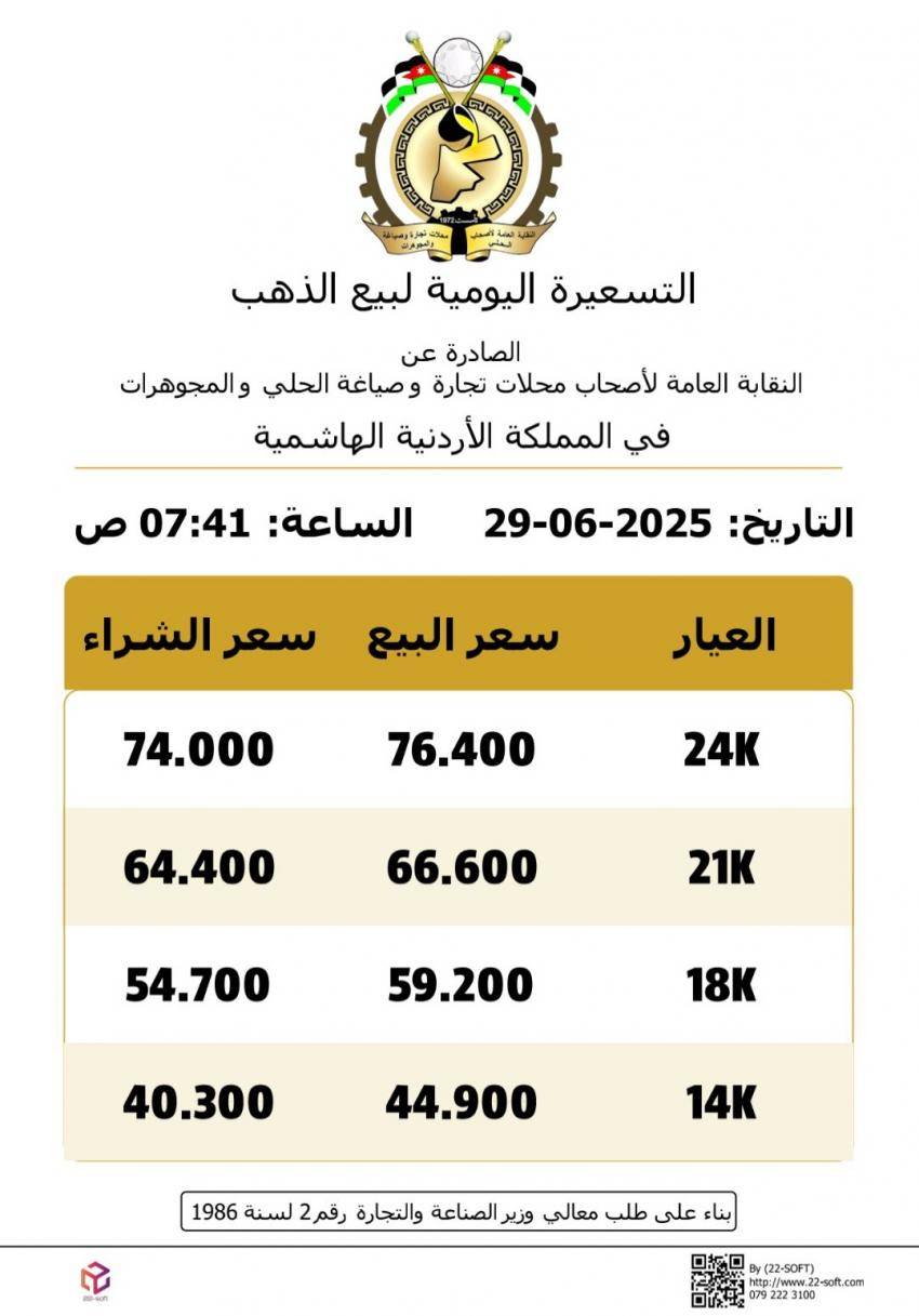 أما أسعار شراء غرام الذهب لعيارات 24 و18 و14 في محلات الصاغة، فقد بلغت 76.40 دينارًا، و59.20 دينارًا، و44.90 دينارًا على التوالي.