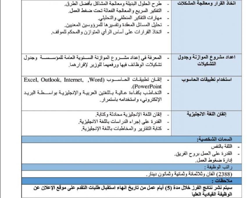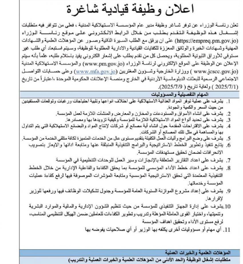 ودعت من تتوافر فيه متطلبات إشغال هذه الوظيفة التقدم بطلب من خلال الرابط الالكتروني على موقع رئاسة الوزراء (https://empreq.pm.gov.jo) على ان يرفق مع الطلب السيرة الذاتية وصور عن المؤهلات العلمية والشهادات المهنية وشهادات الخبرة والوثائق المعززة للكفايات القيادية والادارية المطلوبة للوظيفة، علما أنه سيتم استبعاد أي طلب غير مستوفي للأوراق الثبوتية المطلوبة، ويحصل كل من تقدم بطلب على إشعار الكتروني يفيد باستلام طلبه، علماً بأنه سيتم الإعلان عن الوظيفة على الموقع الإلكتروني لرئاسة الوزراء (www.pm.gov.jo) والمؤسسة الاستهلاكية العسكرية ووزارة الخارجية لشؤون المغتربين وعلى حسابات التواصل الاجتماعي الرسمية للبعثات الدبلوماسية الاردنية في الخارج ومنصة الاعلانات الحكومية الموحدة,اعتباراً من تاريخ (2025/7/1 ) ولغاية تاريخ ( 2025/7/9 ).