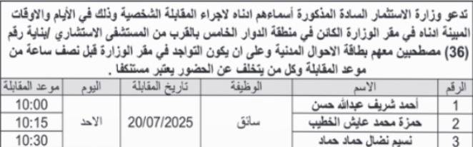 كما دعت وزارة الاستثمار التالية أسماؤهم لاجراء المقابلة الشخصية.