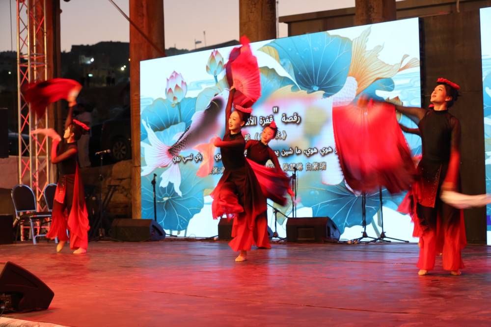 وابدعت في عزف الناي المنفرد لمقطوعة " السوط والحصاد" العازفة تشنغ شيوي يانغ، ووسط اجواء حماسية قدمت الفرقة رقصة " قفزة الاسماك"، و رقصة " الوشاح الاحمر في حقل القمح"، كما قدموا عزف آلة البيبا لاغنية " اهدني وردة " للعازفون هوانغ روي تشي، ما ون ها، وكما تم تقديم عزف جماعي لمقطوعة " خطوة بخطوة نحو الاعلى " ، وفي الختام قدمت الفرقة أغنية "السعادة " ليودعوا به جمهور جرش الذي استقبلهم بكل حب.