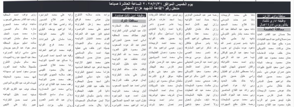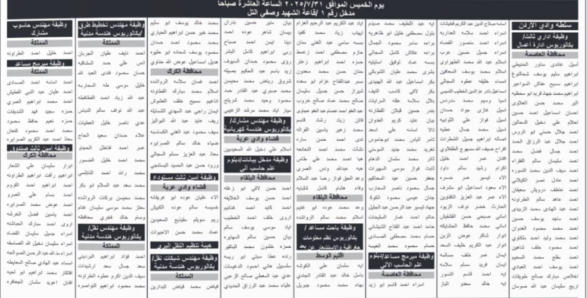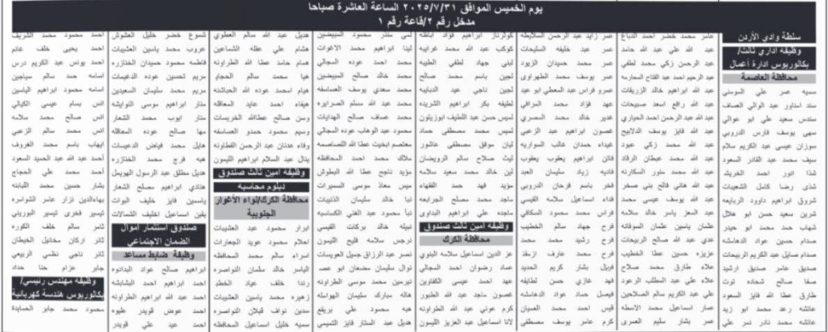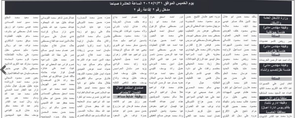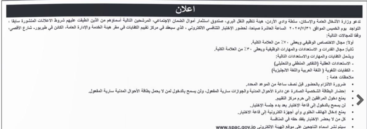 وجهت كل من وزارة الاشغال العامة وسلطة وادي الأردن وهيئة تنظم النقل البري وصندوق استثمار أموال الضمان، اليوم الأحد، دعوة للمرشحين التالية اسماؤهم، للتواجد يوم الخميس 31/7/2025 الساعة العاشرة صباحا لحضور الاختبار التنافسي الالكتروني.