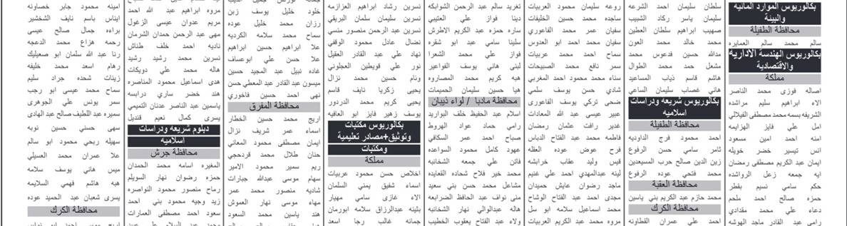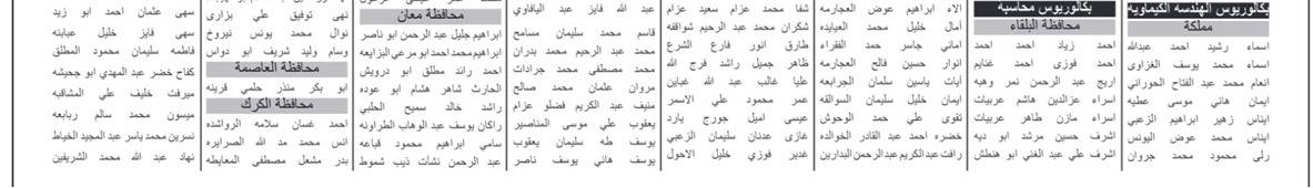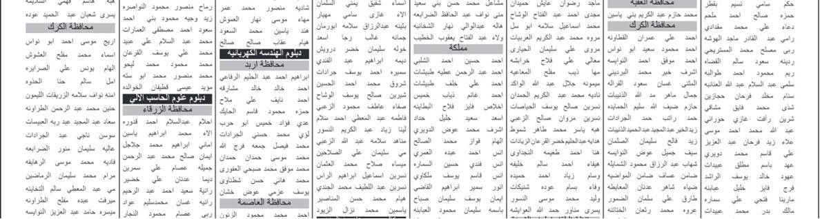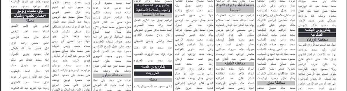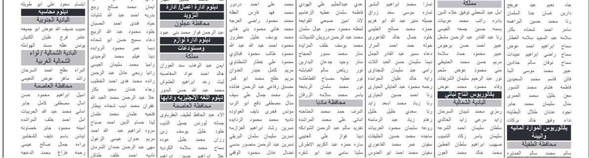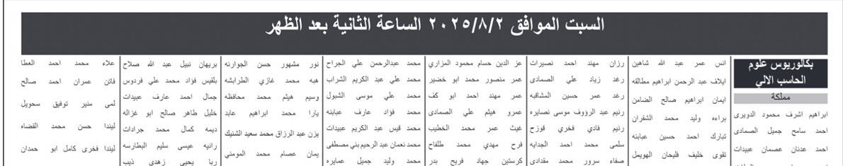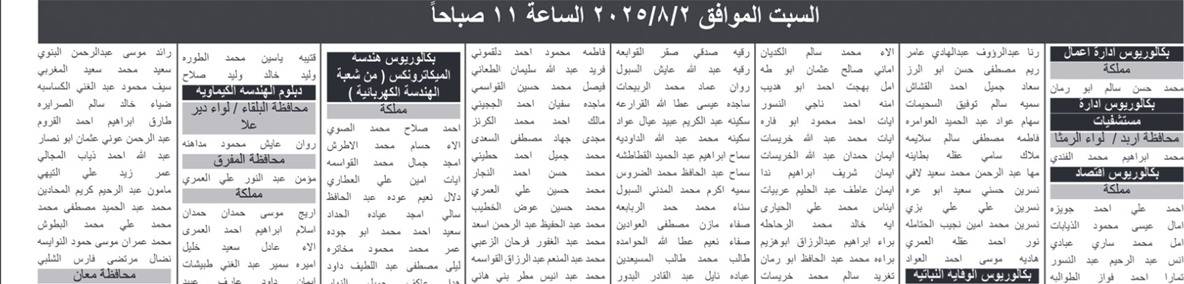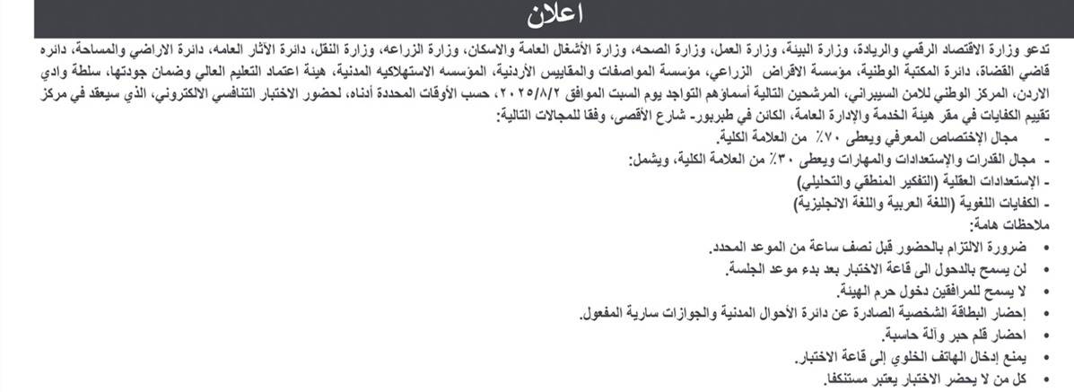 دعت وزارات الاقتصاد الرقمي والبيئة والعمل والصحة والأشغال والزراعة والنقل ودائرة الآثار ودائرة الاراضي ودائرة قاضي القضاة ودائرة المكتبة الوطنية ومؤسسة المواصفات والمقاييس والمؤسسة الاستهلاكية المدنية وهيئة اعتماد التعليم العالي وسلطة وادي الاردن والمركز الوطني للامن السيبراني اليوم الثلاثاء المرشحين التالية اسماؤهم التواجد يوم السبت 2/8/2025 حسب الاوقات المحددة ادناه لحضور الاختبار التنافسي.