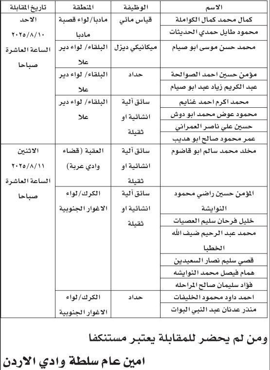 كما دعت سلطة المياه اليوم الثلاثاء التالية أسماؤهم لاجراء المقابلة الشخصية من أجل التعيين على وظائف بعقد محدد، وتاليا الأسماء: