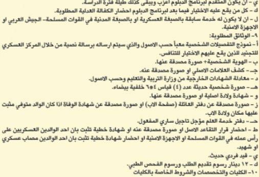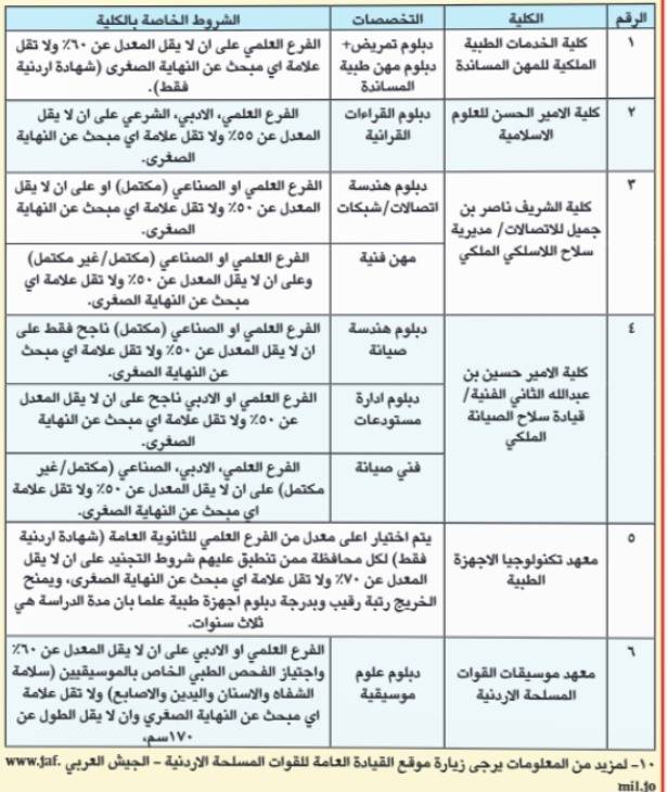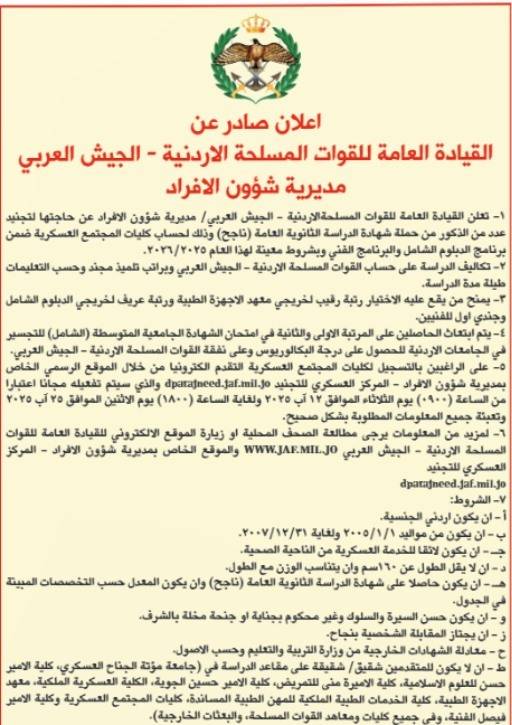 تُعلن القيادة العامة للقوات المسلحة الأردنية – الجيش العربي / مديرية شؤون الأفراد / المركز العسكري للتجنيد عن حاجتها لتجنيد عدد من الذكور بالصبغة العسكرية، من حملة شهادة الثانوية العامة (توجيهي ناجح)، وذلك لحساب كليات المجتمع العسكرية، ضمن برنامجي الدبلوم الشامل والبرنامج الفني، ووفق شروط محددة للعام الدراسي 2025/2026.