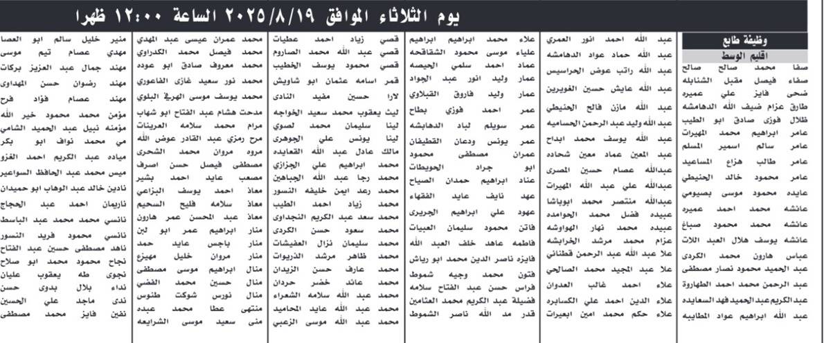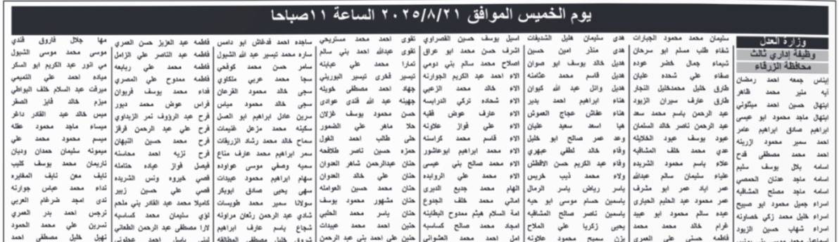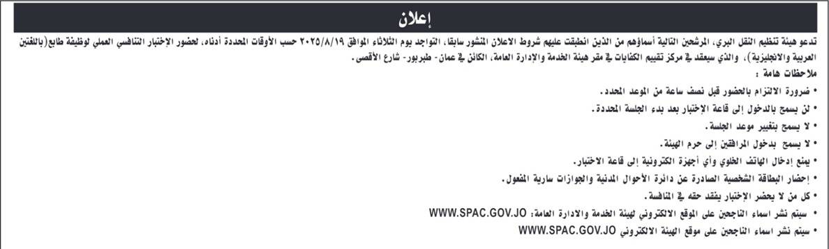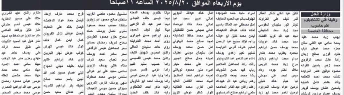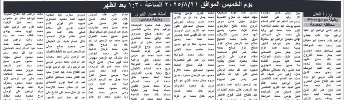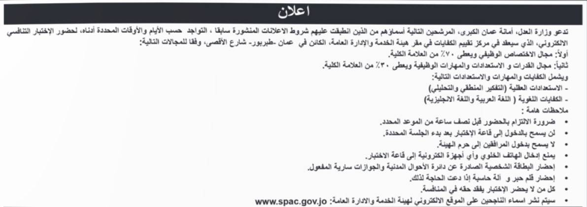 دعت وزارة العدل وأمانة عمان الكبرى وهيئة تنظيم النقل البري اليوم الخميس المرشحين التالية اسماؤهم التواجد حسب الايام والاوقات المحددة ادناه، لحضور الاختبار التنافسي الاكتروني، حسب التفاصيل التالية: