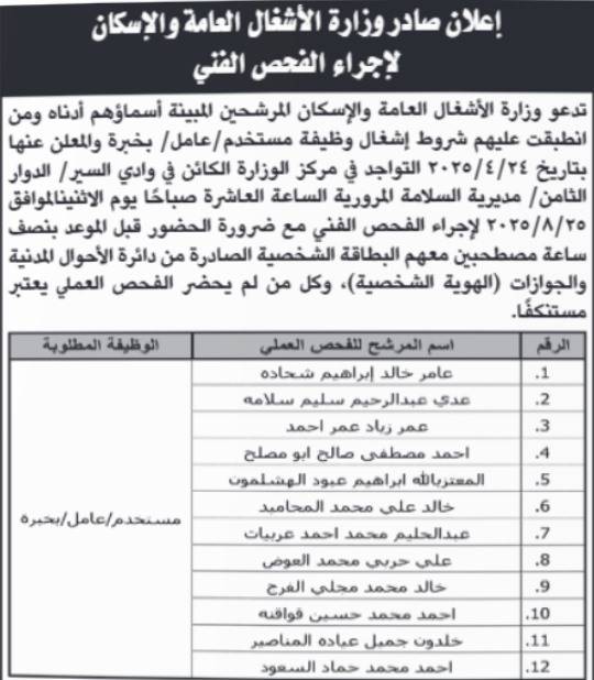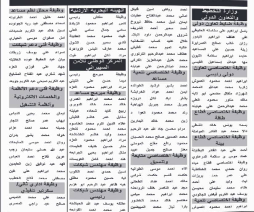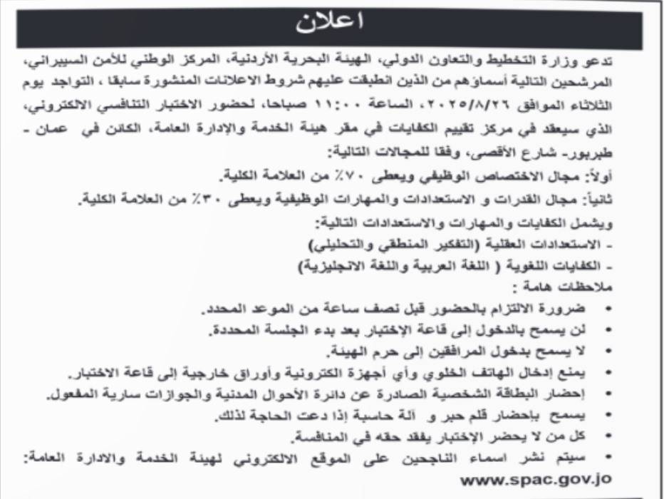 دعت وزارة التخطيط والتعاون الدولي، الهيئة البحرية الاردنية، المركز الوطني للأمن السيبراني، اليوم الثلاثاء، المرشحين التالية أسماؤهم لحضور الاختبار التنافسي الالكتروني.