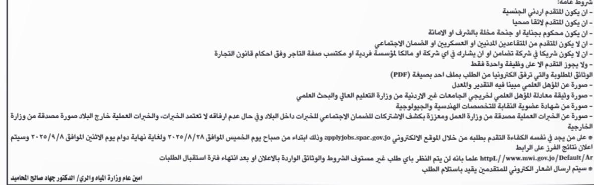 اعلنت سلطة المياه اليوم الاربعاء عن حاجتها لتعبئة وظائف شاغرة بموجب عقد محدد.