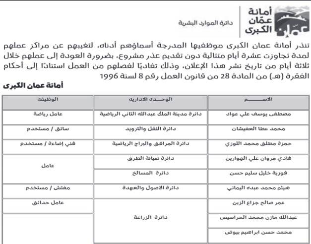 أنذرت أمانة عمان الكبرى اليوم الأحد موظفيها المدرجة أسماؤهم لتغيبهمعن مركز عملكم مدة تزيد على عشرة أيام متتالية دون عذر مشروع .