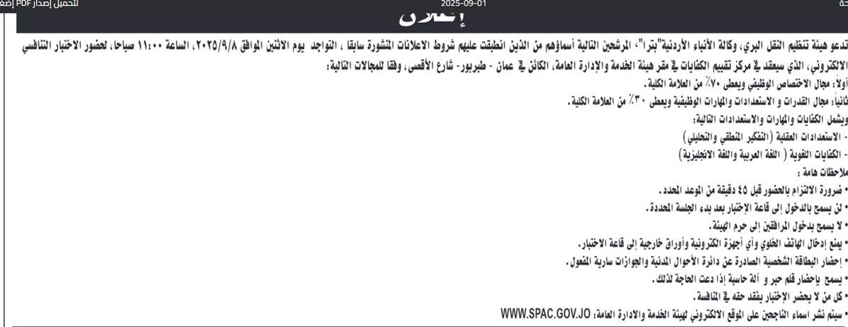 دعت هيئة تنظيم النقل البري، ووكالة الأنباء الأردنية، اليوم الاثنين، المرشحين التالية أسماؤهم، التواجد يوم الاثنين الموافق 8/9/2025، الساعة 11 صباحاً، لحضور الاختبار التنافسي الإلكتروني.