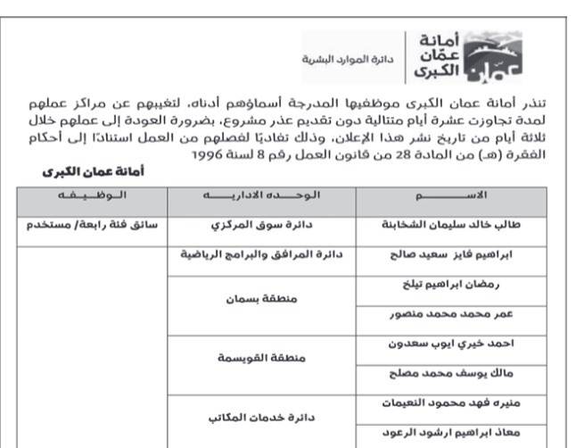 أنذرت أمانة عمان الكبرى اليوم الأحد 18 موظفا بسبب تغيبهم عن مراكز عملهم لمدة تزيد عن عشرة أيام متتالية دون تقديم عذر مشروع.