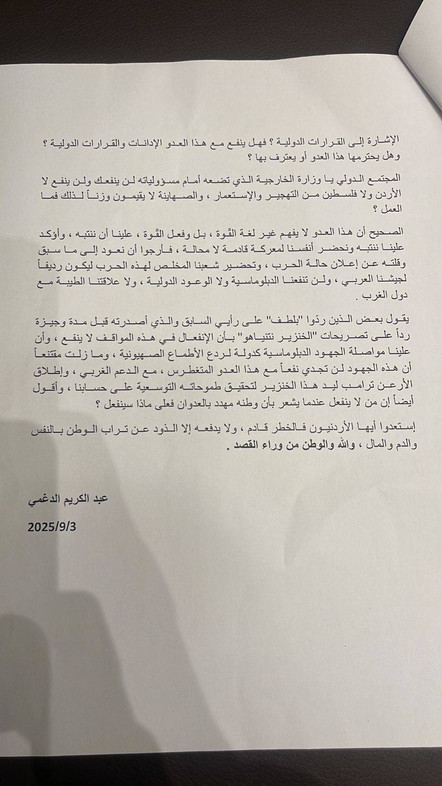 الصحيح أن هذا العدو لا يفهم غير لغة القوة ، بل وفعل القوة ، علينا أن ننتبه ، وأؤكد علينا ننتبه ونحضر أنفسنا لمعركة قادمة لا محالة ، فأرجوا أن نعود إلى ما سبق وقلته عن إعلان حالة الحرب ، وتحضير شعبنا المخلص لهذه الحرب ليكون رديفاً لجيشنا العربي ، ولن تنفعنا الدبلوماسية ولا الوعود الدولية ، ولا علاقتنا الطيبة مع دول الغرب .