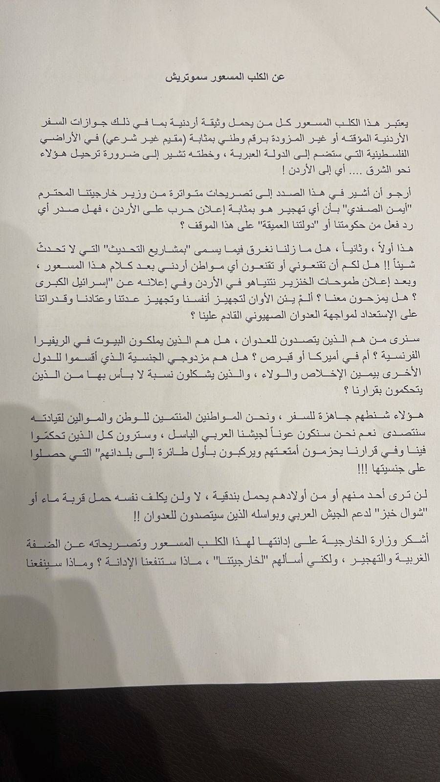 يعتبر هذا الكلب المسعور كل من يحمل وثيقة أردنية بما في ذلك جوازات السفر الأردنية المؤقته أو غير المزودة برقم وطني بمثابة (مقيم غير شرعي) في الأراضي الفلسطينية التي ستضم إلى الدولة العبرية ، وخطته تشير إلى ضرورة ترحيل هؤلاء نحو الشرق .... أي إلى الأردن !