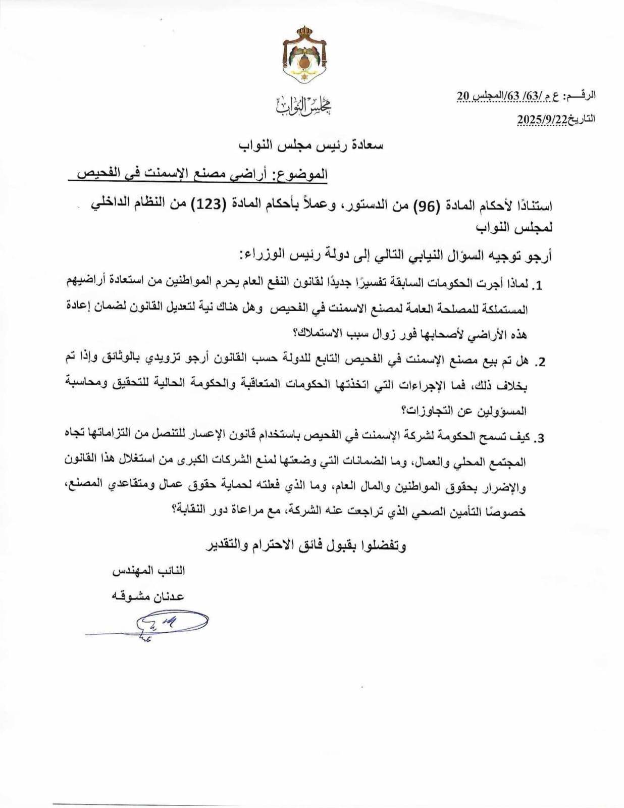 85729-- النائب عدنان مشوقة يسأل الحكومة: متى تُحلّ قضية أراضي مصنع الإسمنت في الفحيص؟ :: صوت عمان الإخباري