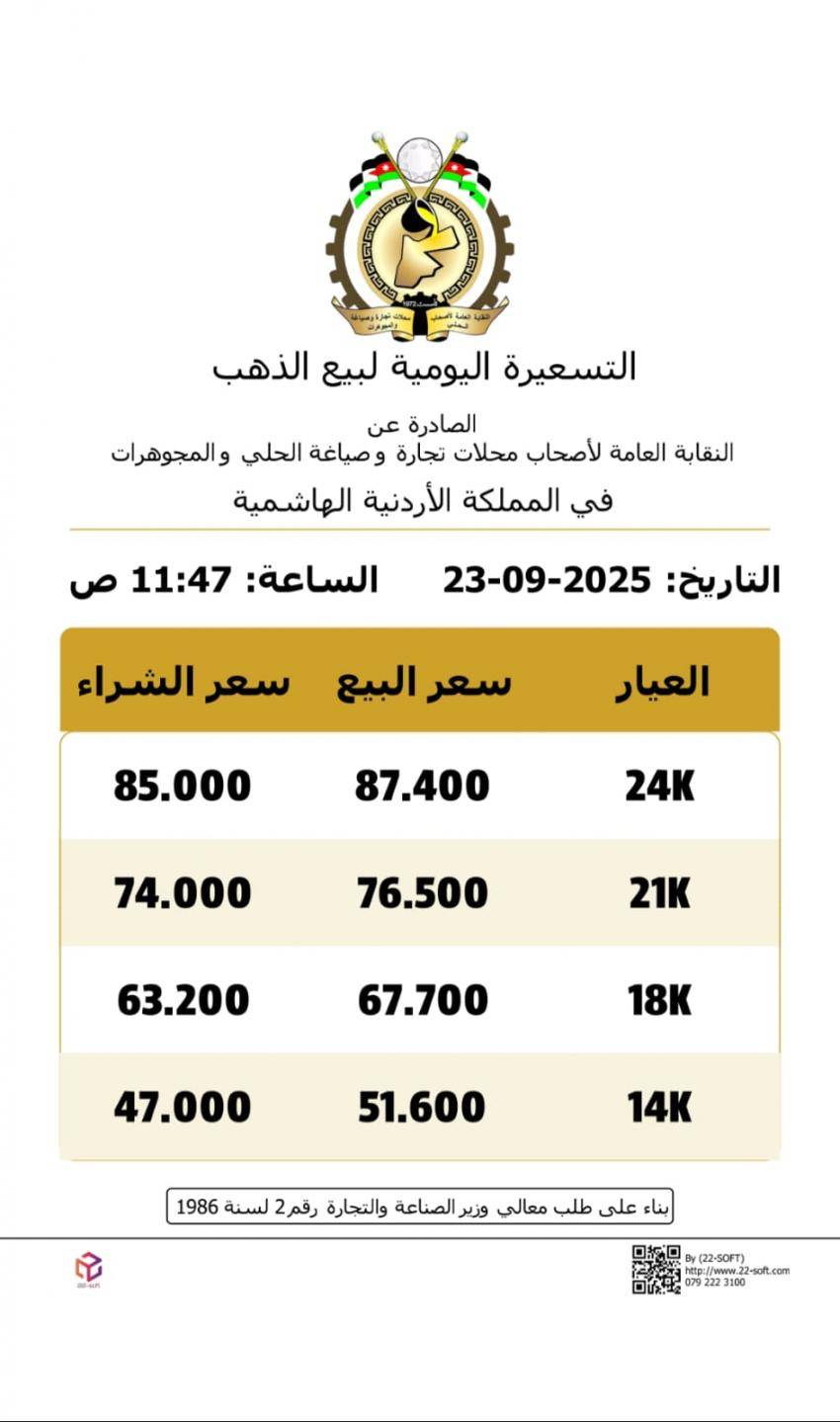 وبلغ سعر بيع غرام الذهب عيار 21 الأكثر طلبا بين المواطنين 76.50 دينارا لغايات البيع من محلات الصاغة، مقابل 74 ديناراً للغرام لغايات الشراء، وفقا للتسعيرة الثانية الصادرة عن النقابة العامة لأصحاب محلات تجارة وصياغة الحلي والمجوهرات.