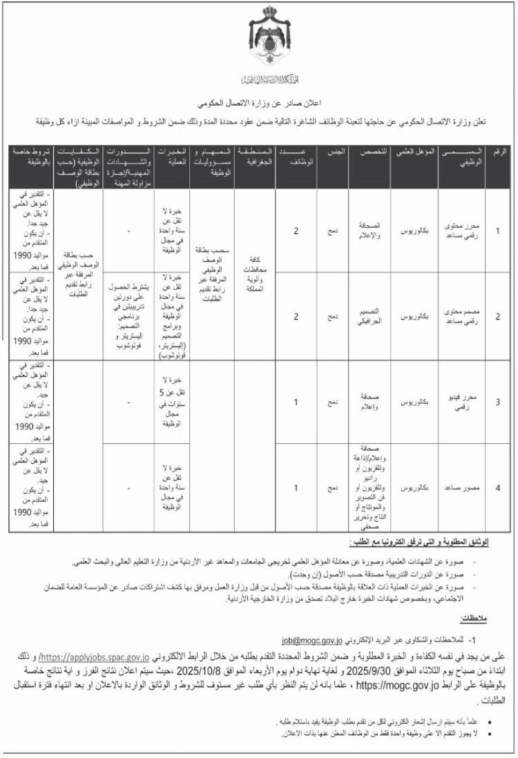 أعلنت وزارة الاتصال الحكومي، اليوم الاثنين، عن حاجتها لتعبئة الوظائف الشاغرة التالية ضمن عقود محددة المدة، وذلك ضمن الشروط والمواصفات المبينة إزاء كل وظيفة.