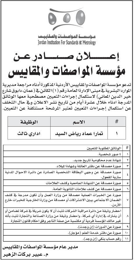 ودعت مؤسسة المواصفات والمقاييس الأسماء التالية لاستكمال إجراءات التعيين.
