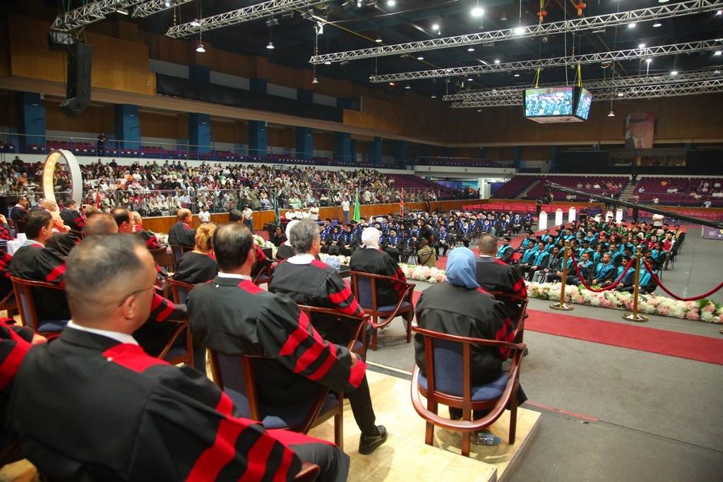 يومٌ نحتفي فيه بتخريج نخبةٍ متميزة من طلبة كلية الدراسات العليا، وكلية الآداب والعلوم، وكلية الحقوق ، وكلية الأعمال ، وكلية العلوم التربوية، وكلية إدارة الضيافة والسياحة.