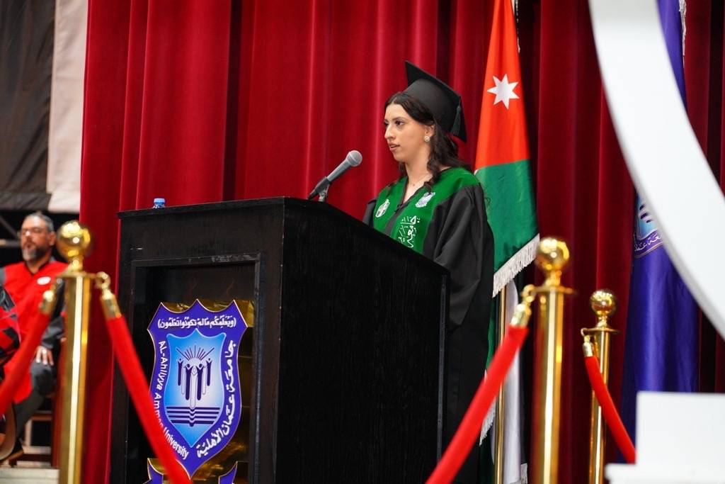ثم باركت لزُمَلَائها وزميلاتها ٱلْـخَرِّيجِينَ وخاطبتهم قائلة : فِي لَحْظَةٍ تَفِيضُ فِيهَا ٱلْعُيُونُ بِٱلْكَلِمَاتِ، أَكْثَرَ مِمَّا يَفِيضُ ٱللِّسَانُ.فَلْنُوصِ أَنْفُسَنَا: أَنْ نَصُونَ مَا ٱكْتَسَبْنَاهُ، أَنْ نَكُونَ لِلْعِلْمِ أَوْفِيَاء لِلْوَطَنِ أَبْنَاءً بَرَرَةً، أَنْ نَكُونَ سُفَرَاءَ رِسَالَةٍ رُعَاةَ أَمَانَةٍ.لِنَجْعَلْ مِنْ أَحْلَامِنَا وَاقِعًا، وَلِنَجْعَلْ مِنْ أَيَّامِنَا ٱلْقَادِمَةِ، ٱلَّتِي سَتَشْهَدُ نَجَاحَاتِنَا، دليلًا عَلَى أَنَّنَا كُنَّا هُنَا، كُنَّا طُلَّابًا فِي جَامِعَةِ عَمَّانَ ٱلْأَهْلِيَّةِ.