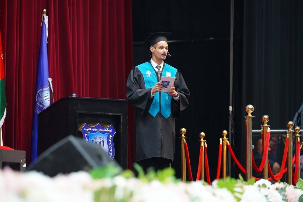 نَقِفُ ٱلْيَوْمَ عَلَى أَعْتَابِ لَحْظَةٍ فَارِقَةٍ فِي حَيَاتِنَا، تَخْتَلِطُ فِيهَا ٱلدُّمُوعُ بِٱلِٱبْتِسَامَاتِ، بفَرْحَةِ ٱلْوُصُولِ وَوَجَلِ ٱلرَّحِيلِ.ٱلْيَوْمَ نَرْفَعُ قُبَّعَاتِنَا، لَا لِنُعْلِنَ ٱلْوَدَاعَ، بَلْ لِنُعْلِنَ ٱلْبِدَايَة .. بِدَايَةَ طَرِيقٍ طَالَ ٱنْتِظَارُهُ.نُوَدِّعُ جَامِعَتَنَا ٱلْحَبِيبَةَ وَنَحْنُ متمسِّكُينَ بِٱلْقِيَمِة مُؤْمِنِينَ بِٱلرِّسَالَةِ أَنْ نَبْقَى أُمَنَاءَ لِلْعِلْمِ، أَوْفِيَاءَ لِلْوَطَنِ.