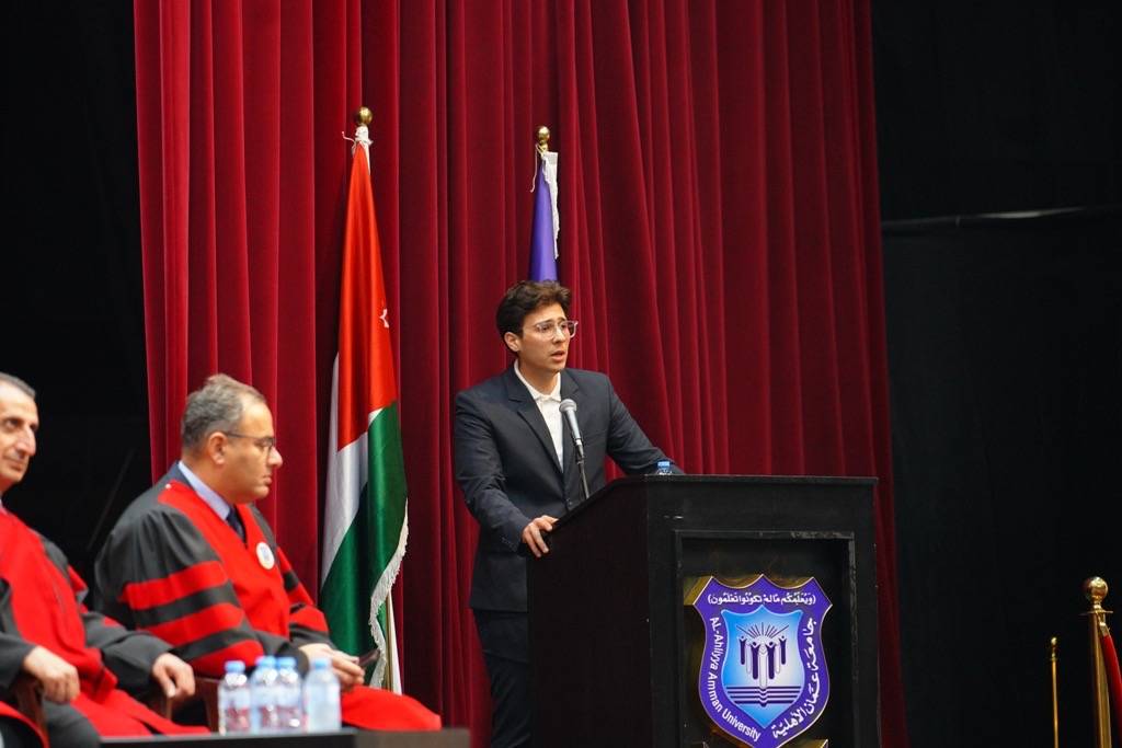 وأضاف : أيها الحضور الأجلّاء، من قلب الأردن النابض، من جامعةٍ وُلدت من رحم الرؤية والبصيرة، نحتفل اليوم تحت راية جامعة عمّان الأهلية، التي لم تكن يومًا مجرد صرح أكاديمي، بل كانت وما تزال منارةً تُشِعُّ علمًا وتميّزًا.