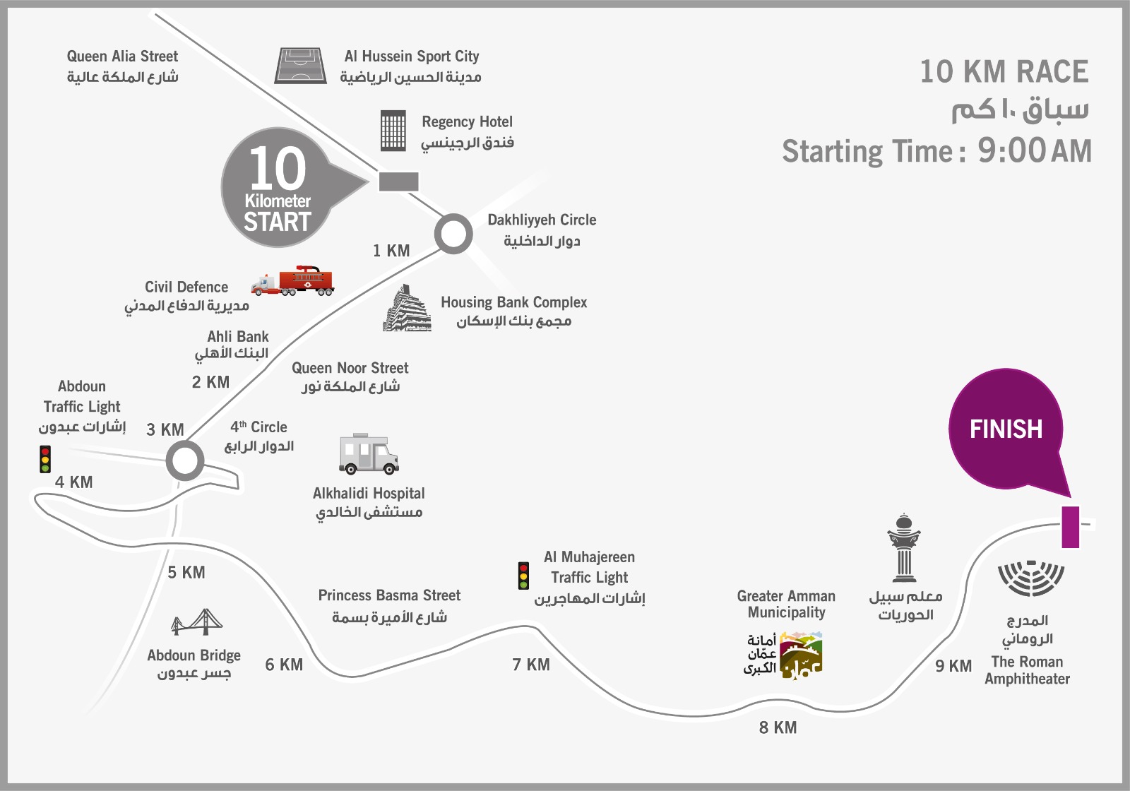 كما سيتم إغلاق شارع الملكة علياء بين دوار المدينة الرياضية ودوار الداخلية بشكلٍ تام، إضافة إلى شارع الملكة نور بين دوار الداخلية والدوار الرابع. وتشمل الإغلاقات أيضًا شارع عقبة بن نافع وشارع الأميرة بسمة بشكل كامل وحتى منطقة الساحة الهاشمية، من الساعة 6 صباحًا وحتى 12 ظهرًا، ضمن مسار سباق الـ10 كم الذي ينطلق الساعة التاسعة صباحًا.