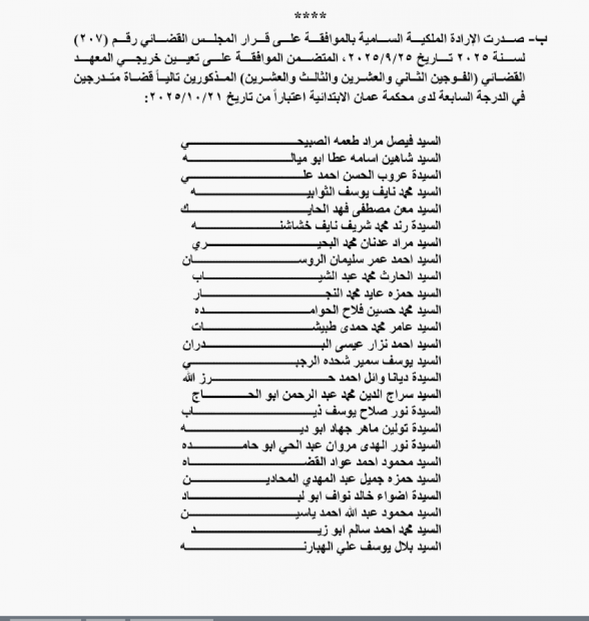 وبحسب القرار، تم تعيين القضاة متدرجين في الدرجة السابعة لدى محكمة عمان الابتدائية، على أن يُعمل بهذا القرار اعتبارًا من تاريخ 21 تشرين الأول 2025.