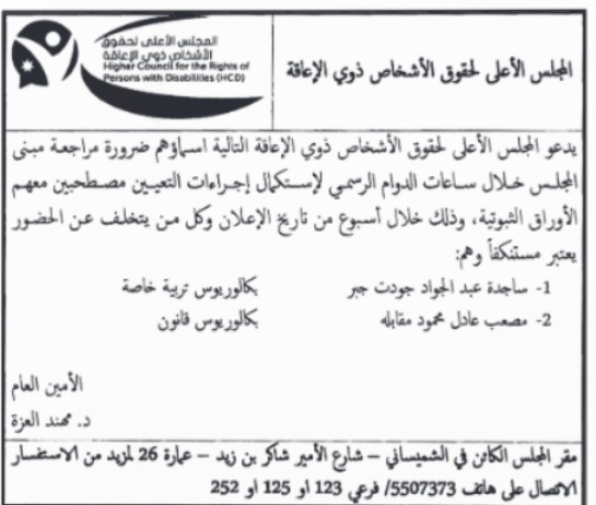 أعلن المجلس الأعلى لحقوق الأشخاص ذوي الإعاقة اليوم الاثنين عن دعوة مجموعة من المرشحين لاستكمال إجراءات التعيين ضمن كوادره، داعيًا الأسماء المنشورة في الكشف الرسمي إلى مراجعة المجلس في المواعيد المحددة لاستكمال الخطوات الإدارية المطلوبة وفق التعليمات المعتمدة.