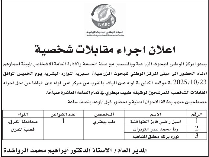 وفي السياق ذاته، أعلن المركز الوطني للبحوث الزراعية عن دعوة عدد من المتقدمين إلى إجراء المقابلات الشخصية يوم الاثنين، وذلك لاستكمال مراحل الاختيار والتعيين وفق الشروط المعلنة مسبقًا، مؤكدًا ضرورة إحضار الوثائق الرسمية والأوراق الثبوتية المطلوبة خلال المقابلات.