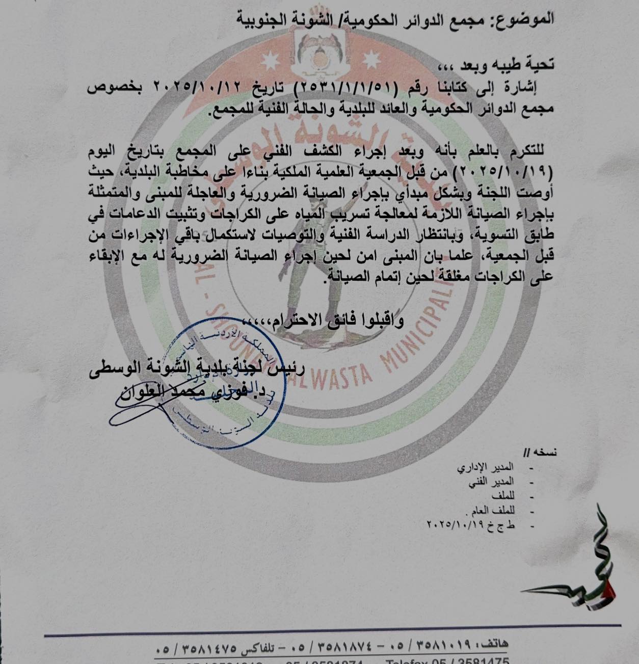 في إطار متابعته الحثيثة لأوضاع الأبنية والمرافق العامة، أوعز رئيس لجان بلدية الشونة الوسطى الدكتور فوزي العلوان بإجراء الصيانة العاجلة لمجمع الدوائر الحكومية التابع للبلدية، وذلك استناداً إلى نتائج الكشف الفني الذي أجرته الجمعية العلمية الملكية بتاريخ 19 تشرين الأول 2025.