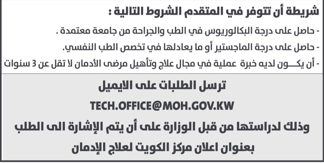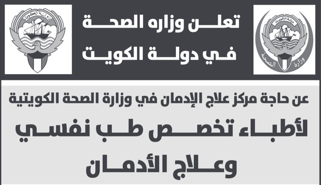 أعلنت وزارة الصحة في دولة الكويت عن حاجتها لتعيين أطباء اختصاصيين في الطب النفسي وعلاج الإدمان للعمل في مركز علاج الإدمان التابع للوزارة، وذلك ضمن خطة التوسع في الخدمات الطبية المتخصصة ودعم الكوادر الصحية بالكفاءات المؤهلة.